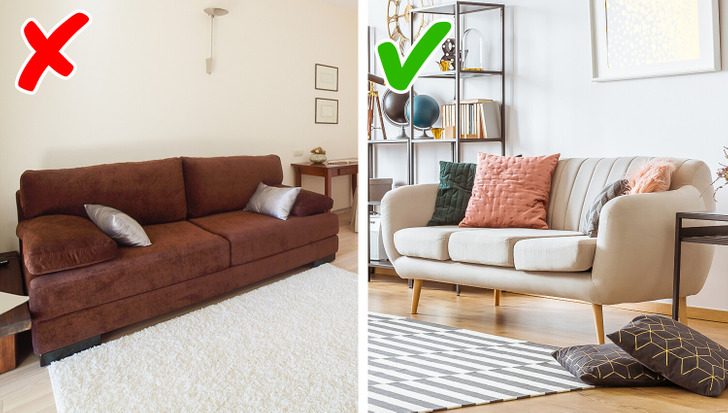 Мебель на высоких ножках создает эффект парения, поскольку вы можете видеть пол и вам кажется, что мебель вовсе не стоит на нем. Из-за этого создается впечатление, будто комната имеет больший размер, чем на самом деле. А вот диван в классическом понимании может, наоборот, визуально уменьшать пространство.