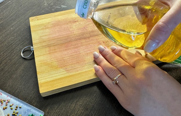 Если ваша разделочная доска окрасилась от свеклы, не стоит паниковать. Просто смажьте её растительным маслом и промойте горячей водой. Растительное масло поможет удалить пигмент от свеклы, а затем горячая вода избавит от остатков.