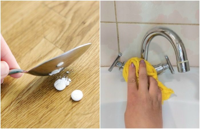 Измельчите несколько таблеток аспирина любым удобным для вас способом, смешайте с небольшим количеством воды, чтобы получилась кашица, а затем нанесите на кран, душевую лейку и другую сантехнику, на которой есть налет. Через полчаса смойте остатки аспирина и наслаждайтесь результатом. Средство отлично справится со стелами известкового налета, и металлические поверхности вновь будут сиять.