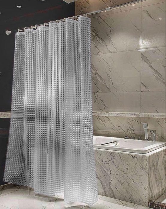 Пара шторок для ванной, между которыми затесались пузырьки.
