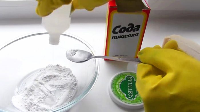 Далее готовится чистящее средство. Для этого в емкости смешиваются 1 ст.л. зубного порошка и 2 ст.л. пищевой соды. К ним вливается перекись водорода до получения пастообразной консистенции.