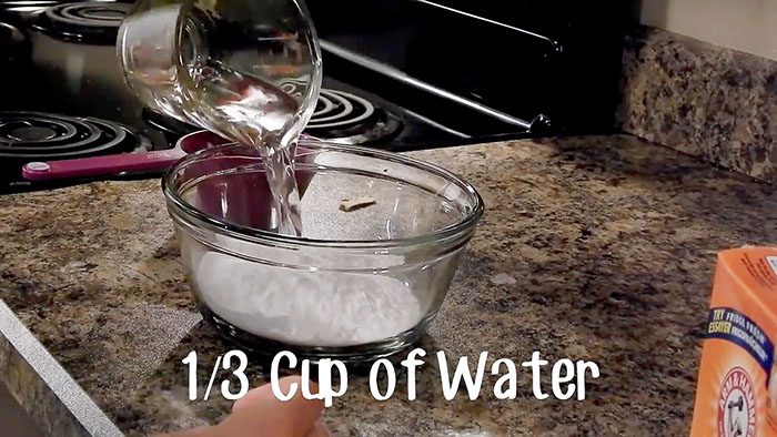 Берем стакан соды и одну треть стакана обычной воды. Все это тщательно перемешиваем до образования однородной массы.