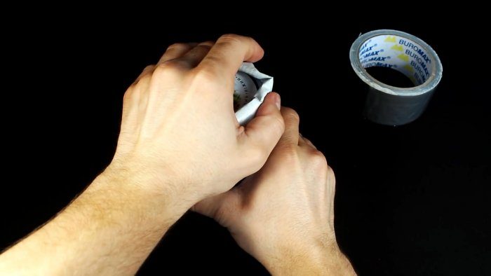 На половину окружности крышки приклеивается скотч. Потянув за него, ее можно открыть. Это потребует приложить усилие, но более развитых мышц, поэтому все получится.