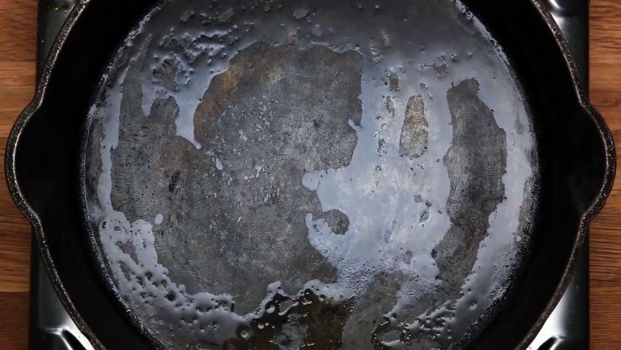 Нагрейте сковородку на плите до полного удаления остатков влаги.