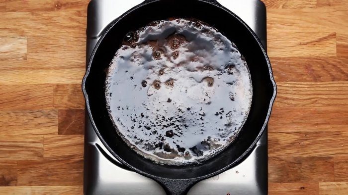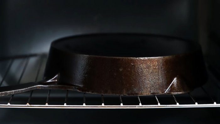 Поставьте сковороду в духовку, включите ее на максимальную температуру нагрева. Оставьте посуду в таком состоянии на 40—50 минут. Не забудьте на полную мощность включить вентилятор вытяжки, в противном случае в помещении появятся непринятые запахи.