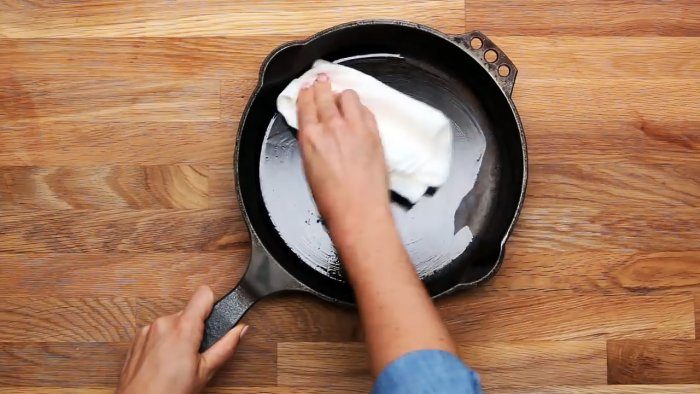 Влейте 30—50 мл постного масла и бумажной салфеткой разотрите его по всей внутренней поверхности. Не оставляйте пропусков, с усилием втирайте масло во все микротрещины. Именно в них в первую очередь образуется нагар и прилипает пища.