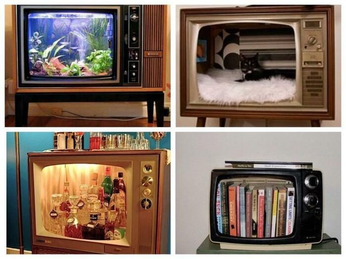 Но, если книги портить не хочется, для них нужно сделать красивые книжные полки. Существуют множество креативных способов превратить старые огромные телевизоры в практичные вещи. Убрать внутренние детали, оставив лишь каркас, и разместить там любимые книги. Это будет необычная и стильная полка для хранения литературы, у старевшие объемные компьютерные мониторы тоже отлично подойдут для этой цели.