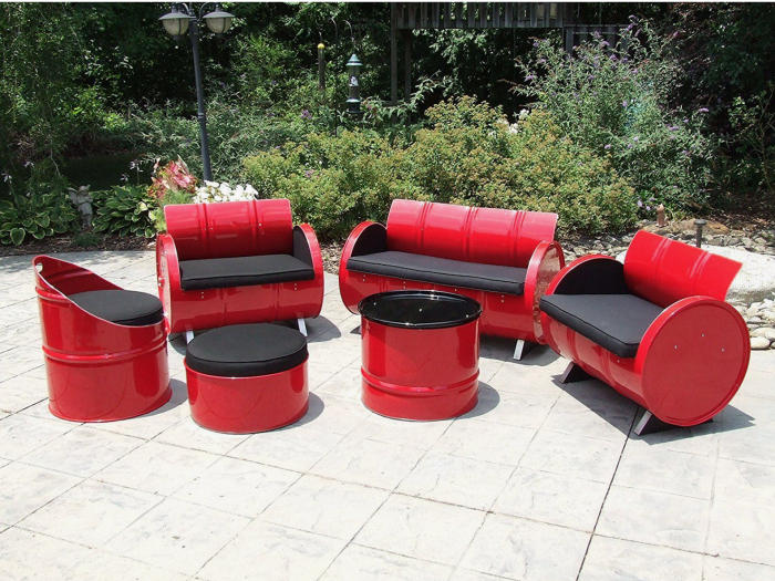 Старая деревянная бочка может стать отличным столиком для сада. Нужно просто отрезать верхнюю часть и покрасить бочку в желаемый цвет. Для удобства дополнить такой столик также обивкой из старой ткани, чтобы создать стильный уголок для отдыха.