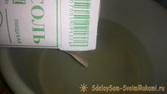 1. Наливаю в таз воды, насыпаю 200 грамм соли.