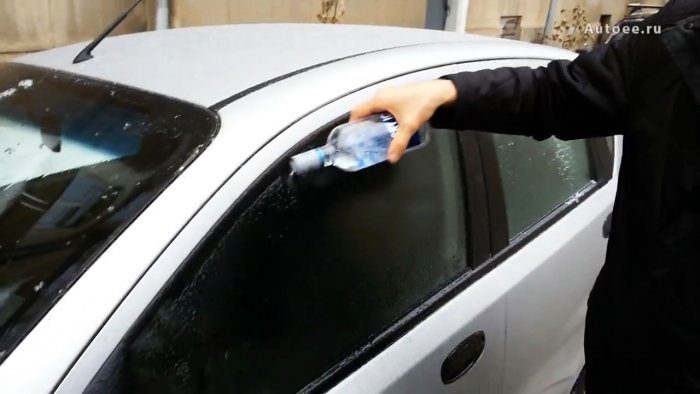 Можно использовать специальные жидкости размораживатели для стекол. Это удобный простой вариант, но не бесплатный.