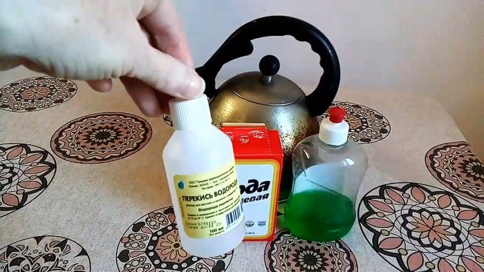 В отдельной емкости смешиваются: 1 ст.л. с горкой соды, 2 ст.л. перекиси водорода и 1 ст.л. моющего для посуды.