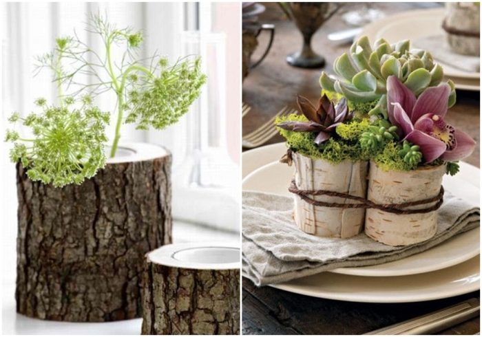 Как бы странно это не звучала, но из пня можно сделать даже вазу для сухоцветов, гортензии, еловых веток, хлопка, подсолнухов и других декоративных цветов, и листьев, которые могут стоять без воды несколько месяцев. Выдолбите в центре пня углубление нужной формы и размера, затем добавьте немного керамзита, или же поставьте старую непригодную для использования вазу, в качестве внутренней облицовки. После пройдитесь по пню морилкой и краской по желанию. Также можно использовать различный декор, чтобы придать эко-вазе оригинальный вид, привлекающий внимание с первых минут.