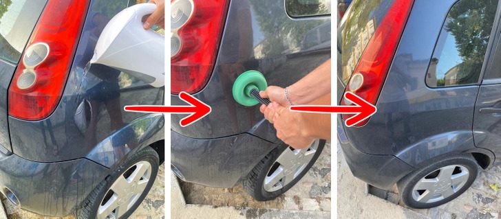 Предварительно очистите область вмятины. Полейте на нее кипятком, вскипятив воду в кастрюльке или чайнике. Затем возьмите вантуз и надавите на впалое место, а потом аккуратно потяните на себя, пока вмятина не выпрямится. При необходимости можно повторить все действия.