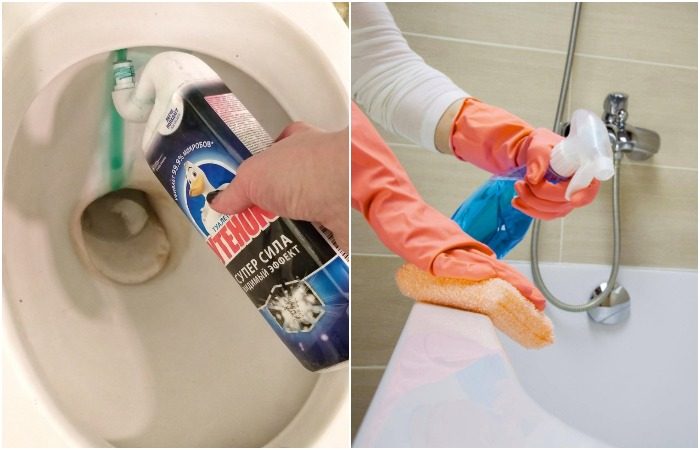 Сначала залейте средством унитаз, а затем – натрите ванну