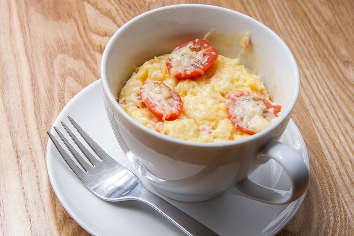 Возьмите большую кружку, сбрызните ее дно и стенки антипригарным спреем или смажьте обычным растительным маслом, разбейте несколько яиц, налейте небольшое количество воды или молока, добавьте специи по вкусу и хорошо перемешайте вилкой либо венчиком. После этого поставьте кружку в микроволновку и установите таймер на полторы минуты. Каждые 30 секунд омлет нужно помешивать. В итоге получается очень вкусный и полезный завтрак, требующий минимум времени и усилий.