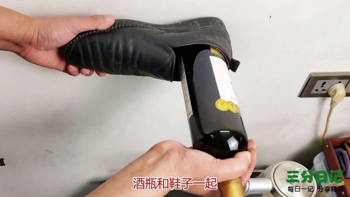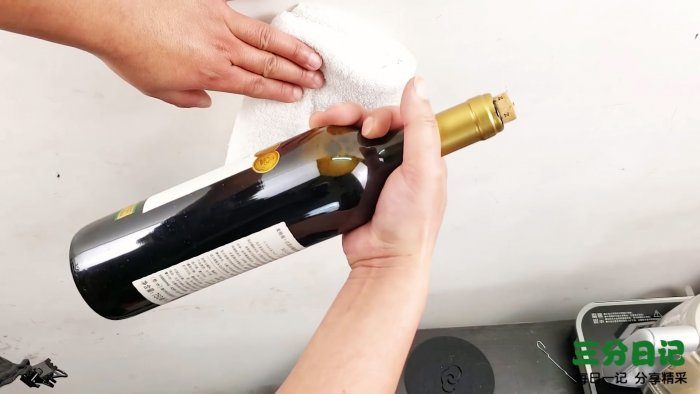 С горлышка бутылки удаляем пластиковую оболочку. Полотенце удерживаем у стены, а дном бутылки аккуратно ударяем по полотенцу в стену.