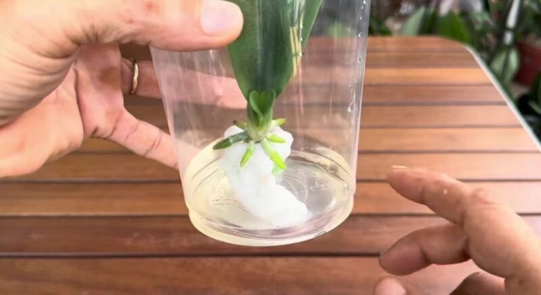 Для дальнейшего восстановления орхидеи потребуется смастерить конструкцию, состоящую из горлышка пластиковой бутылки и ватного диска. Листочек орхидеи необходимо разместить на ватном диске и поместить в высокий пластиковый стакан. Налейте в стакан немного воды: очень важно, чтобы вода не касалась растения. Всю необходимую влагу орхидея будет получать благодаря ватному диску.