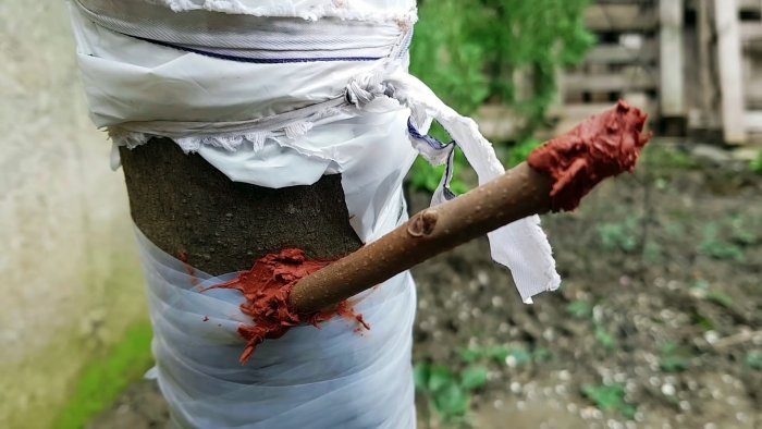 В конце следует замазать садовым варом или другой пастой стыки между лентой и привоем. Он защитит прививку от затекания воды. Также варом замазывается свежеобрезанный торец привоя.