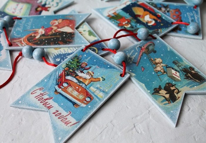 Последние несколько сезонов тема ретро невероятно актуальна, особенно, когда речь касается Нового года. В ассортиментах магазинов сразу появляются подарочные пакеты, открытки, елочные игрушки с такой тематикой. Так почему бы не поддержать тренд, и не добавить в свою квартиру немного ретро? Для этой цели идеально подойдут флажки или гирлянды. А если в ваших запасах есть советские открытки, вы вполне можете сделать такой декор своими руками.