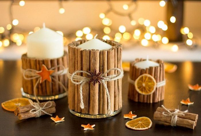 Задекорируйте свечи палочками корицы.