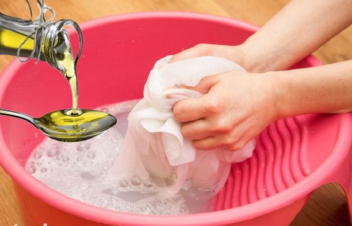 Чтобы вывести загрязнения, нужно приготовить раствор из следующих компонентов: пять литров горячей воды, три столовых ложки растительного масла, 200 граммов стирального порошка и две столовых ложки белизны. Хорошо все перемешайте и замочите грязные полотенца примерно на три часа. По истечении времени достаньте их из таза, отожмите и постирайте в стиральной машине на привычном режиме.