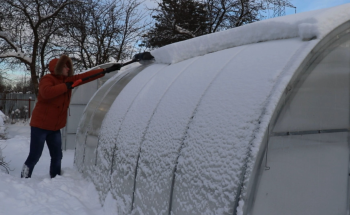 Но, ситуации бывают разные, и если хозяева проживают, либо имеют возможность приезжать на дачу зимой, целесообразно будет очищать теплицу от накопившегося снега. Для этого лучше пользоваться более мягкими инструментами, из-за холода любой материал может стать ломким и его важно не повредить. Дожидаться большого количества снега на крыше теплицы не стоит.