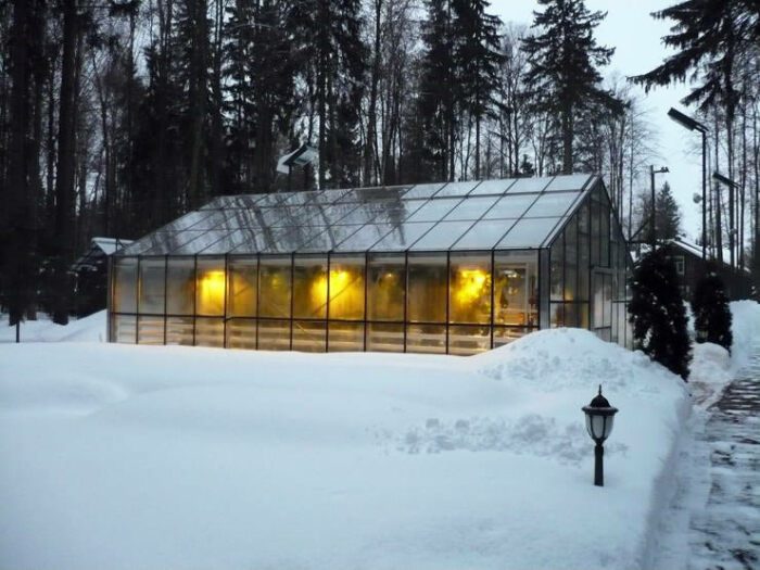 Теплицу также важно правильно расположить на территории участка. Если она будет находиться под каким-то под укрытием вроде деревьев или больших кустарников, навесов от дома, то на ней также будет скачиваться меньше снега. Но, увы, и летом такая теплица будет хуже выполнять свои функции. Из-за того, что она будет находиться в тени, растения внутри получат меньше солнечного света.