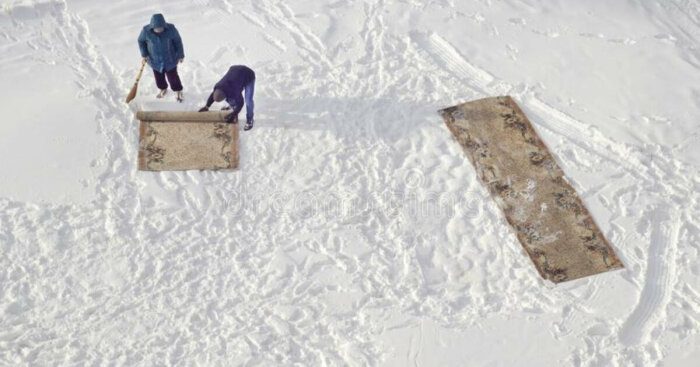 Хороший, проверенный временем способ очистки ковров, которым занимаются из поколения в поколение от любой грязи это чистка снегом. Если получается подгадать уборку под то время, когда на улице выпадает свежий снег, это лучшее время для чистки ковров. Тут всё просто, на саму поверхность нужно насыпать немного свежевыпавшего снега и пройтись по нему веником или шваброй или выбивалкой. Ковёр станет светлее на тон моментально, а значит его поверхность очистится. После его нужно будет повесить на перекладину, ещё раз выбить и дать высохнуть.