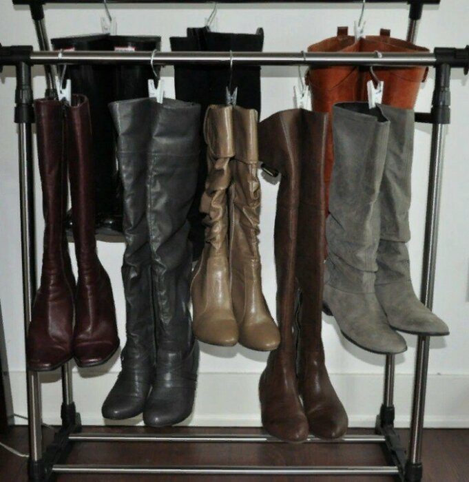 Если нет возможности хранить обувь в коробках, то можно придумать специальные вешалки с зажимами для сапог, и высоких ботинок. Такое хранение позволяет стечь воде и быстрее подсохнуть. А если нет возможности её установить, то подойдёт помещение внутрь сапог бумага или пластиковая бутылка.