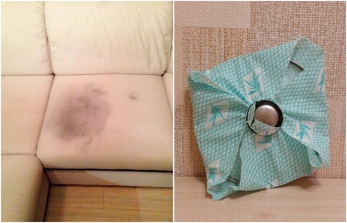 Вне зависимости от того, каким образом пятно появилось на мебели, оно сильно расстраивает и действует удручающе. К счастью, в магазинах можно найти большое количество средств для борьбы с различными загрязнениями на мебельной обивке. А чтобы ускорить процесс уборки и сделать его более эффективным, сделайте следующее: обмакните тряпку в чистящее средство, хорошо отожмите и закрепите на крышке от кастрюли или сковороды. Получится специальное приспособление, которым гораздо проще и быстрее чистить мебель.