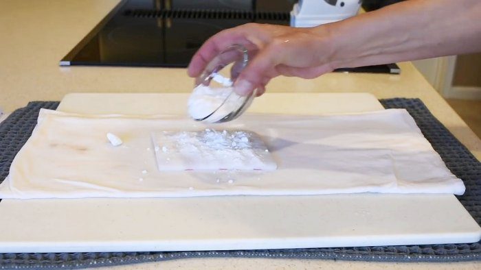 Расстелем влажное полотенце. На него поместим влажную салфетку или ткань сложенную в несколько раз. Сверху насыпьте 2 столовые ложки соды.