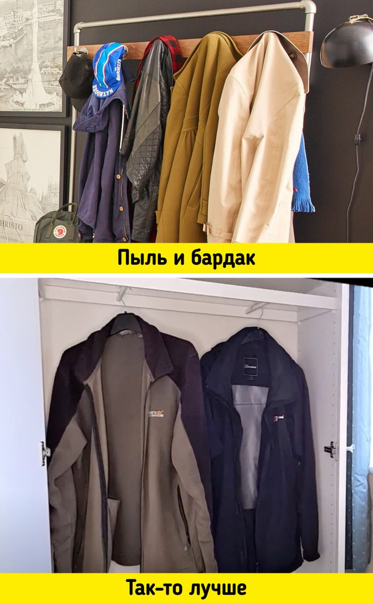 Закрытые шкафы лучше открытого хранения: висящая на крючках одежда пылится и создает визуальный шум, не добавляя прихожей ни чистоты, ни красоты. Если размеры прихожей не позволяют разместить полноценный шкаф, хотя бы храните одежду на плечиках — так она не выглядит бесформенной кучей, да и сама одежда прослужит дольше: петельки не будут отрываться, а ткань вытягиваться.