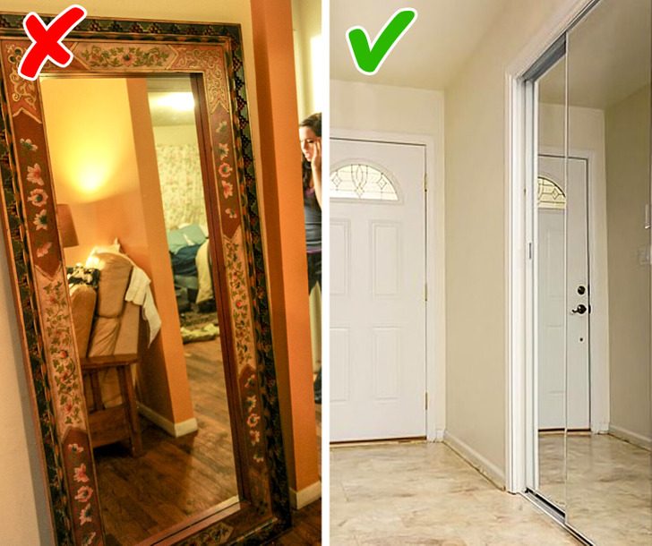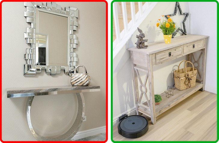Очень важно проследить, чтобы в зеркале не отражались куртки, сумки и шарфики, развешенные на стенах, иначе пространство будет казаться захламленным. Стоит также разместить зеркало на правильной высоте — его середина должна находиться на уровне глаз взрослого. Если расположить зеркало прямо напротив входной двери, то прихожая будет казаться меньше, так что лучше повесить его рядом с дверью.