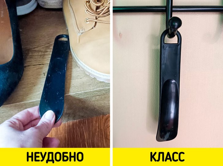 В стремлении поддерживать в прихожей порядок мы порой убираем с глаз долой полезные вещи и прячем в шкаф или корзинку рожок для обуви. Такие необходимые мелочи лучше развесить на крючках, чтобы гостям не приходилось рыться в прихожей в поисках рожка. Ключи тоже стоит хранить на специальных крючках, чтобы их можно было быстро найти.