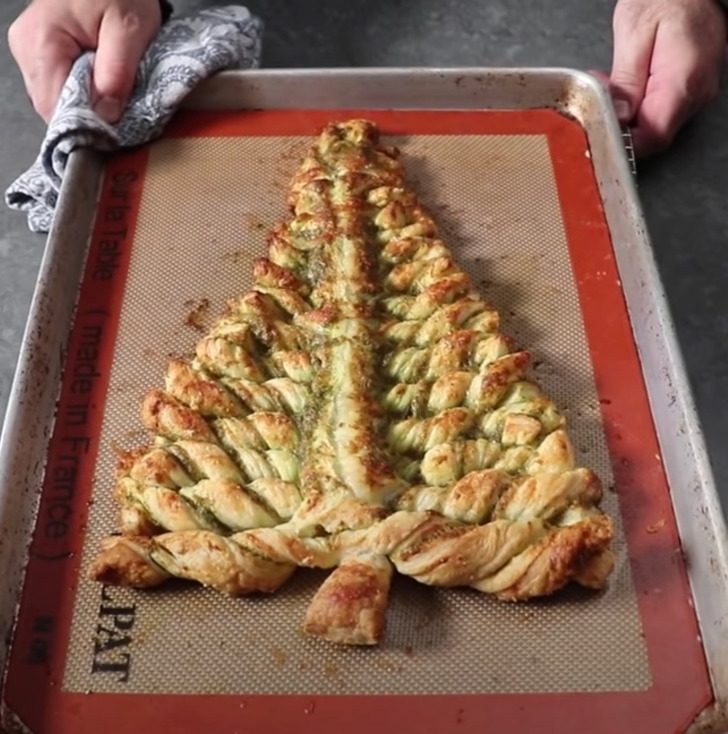 Такую елку можно сделать с начинкой из соуса песто и сыра, или смазать шоколадной пастой, а сверху посыпать сахарной пудрой — выбирать вам. Мы расскажем про первый вариант.