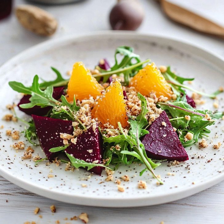 Этот вкусный салат прост в приготовлении, а выглядит просто замечательно! Количество продуктов варьируйте по вкусу — кому-то нравится большое количество рукколы, кому-то хочется больше апельсина, кому-то — свеклы.