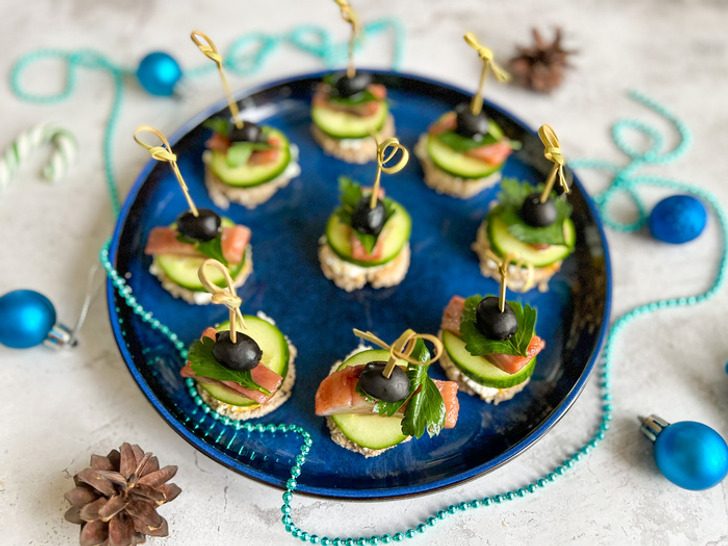 Здесь самые простые ингредиенты, но как вкусно и красиво получается! И есть удобно. Берем обычный хлеб (черный или белый) и вырезаем кружочки рюмкой. Свежий огурец тоже режем кружочками. Важно, чтобы они были примерно одного размера с хлебом. Каждый кружочек хлеба смазываем горчицей. А поверх горчицы — сливочный сыр. Выкладываем наши заготовки на красивое блюдо и собираем канапе: кладем на хлеб огурец, селедку и в конце — половинку маслины без косточки. Скрепляем шпажкой. Можно еще украсить листиком петрушки.