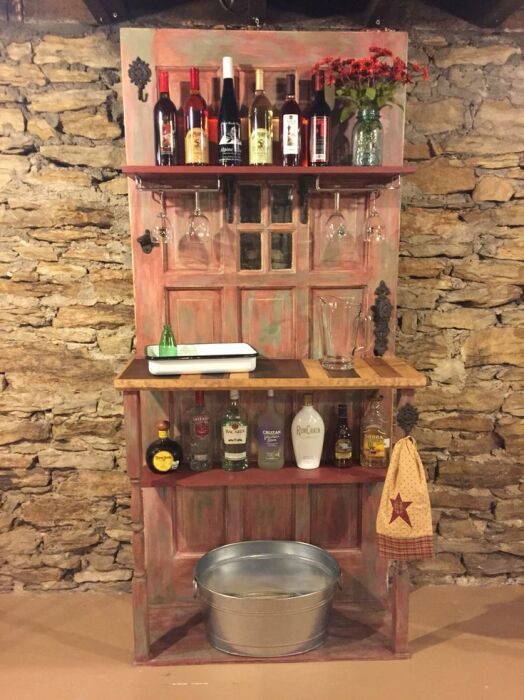 Когда дома имеется старая дверь, она также может стать мини-баром. Каким же образом? Дверь необходимо плотно и прочно установить на консоли, либо приделать к ней небольшие ножки. Полки и ящики также прикрепить отдельно, но прочно. На них отлично будут смотреться разноцветные бутылки, бокалы, а также чашки или стаканы.