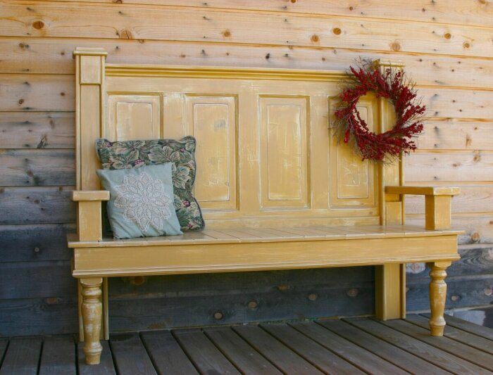 Когда не хочется заморачиваться, то из старой двери делается простая скамейка для улицы, можно даже без спинки. В саду она будет отлично и натурально смотреться, а в доме просто невероятно оригинально. Материалов для этого нужно совсем немного, как и времени на переделку.