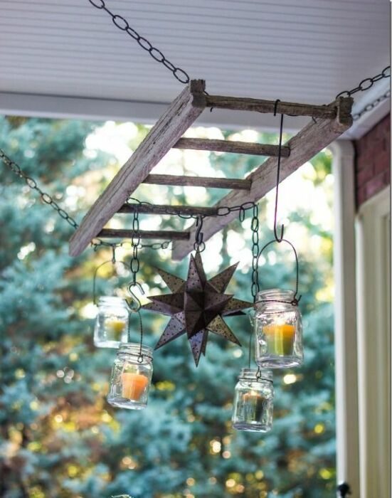 Несомненно, сама оригинальная, пусть и не самая практичная идея — это создать из старой лестницы необычный светильник. Он может быть как подвесной на стене или потолке, так и просто в виде торшера, стоящего на полу. Для того чтобы такое смастерить, будут нужны некоторое количество лампочек и провода. Светильники можно прикрепить к ступеням в любом порядке либо как-то упорядочить на своё усмотрение. Этот элемент не обязательно должен быть для дома, но также и отлично будет смотреться на заднем дворе. Отлично дополнит нотками рустикальный стиль если взять лампочки с винтажными подвесками.