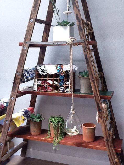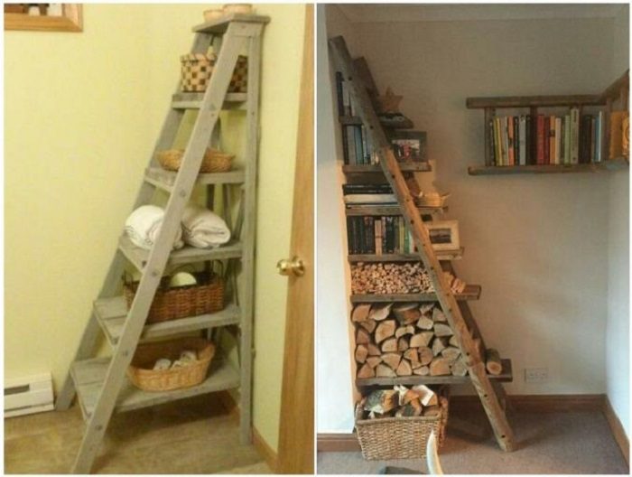 Когда дома осталось несколько уже ненужных стремянок, то удастся создать целый большой стеллаж, он точно будет очень практичным. Мебель подобного формата впишется не только в дачный интерьер, но и в квартиру, а что уж говорить про мастерскую или даже гараж. Обычную же лестницу можно поставить к стене или подвесить, получатся подвесные полочки. Важно лишь проверить, что такая старая лестница точно выдержит нагрузку и не упадёт, а ступеньки выполняющие роль полок не прогнутся и смогут выдержать предполагаемую нагрузку.
