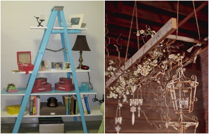 Старая лестница — новые полки. Она может превратиться в оригинальный шкафчик, этажерку или стеллаж. Туда отлично поместятся книги, вазочки, декоративные свечи, поделки или сувениры. Для того чтобы конструкция стала наиболее устойчивой, её нужно прикрепить к стене на саморезы. Для того чтобы вещей поместилось больше, на лестницу можно прикрепить и полки, разместив из на самих ступенях. Такой подход к созданию мебели абсолютно нестандартный и придаст невероятную индивидуальность интерьеру.