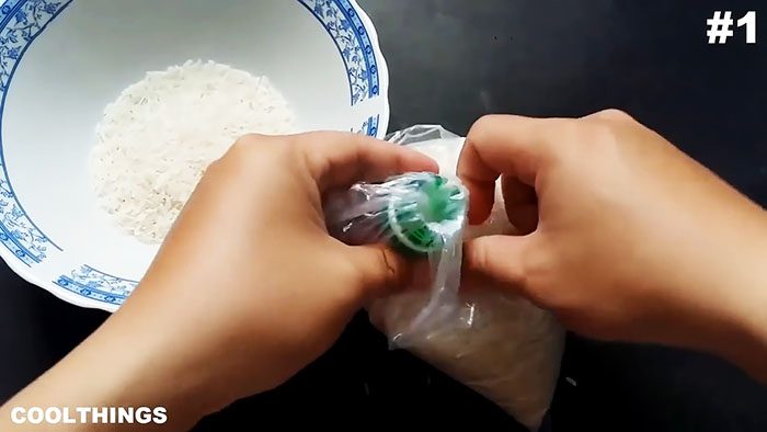 Открытую сторону полиэтиленового пакета с сахаром, крупами, чистящими средствами и т. д. собираем в жгут, просовываем в горлышко с открученной пробкой, обхватываем его и равномерно распределяем пленку по кругу. Аккуратно, без лишнего усердия, закручиваем крышку. Продукт легко и надежно упакован.