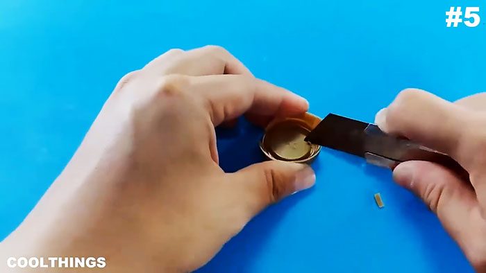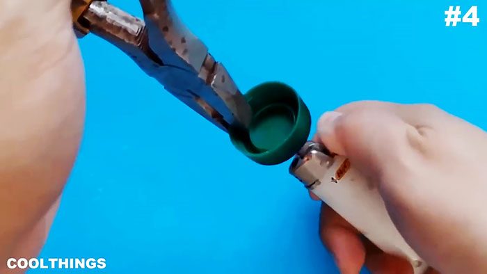 Удерживая плоскогубцами крышку за край, нагреваем ее снизу пламенем зажигалки, пока пластик не размягчится.