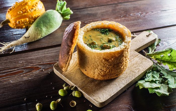Собственно, это действительно было удобно: испекли каравай, разделили надвое, вытащили мякиш — на выходе получается пара посудин для супа, и мягкая сдоба вприкуску. Могли просто нарезать кусочками хлеб и класть на них разные продукты — что-то вроде предтечи бутерброда. И только на излёте Средневековья у людей всё чаще появлялась собственная посуда в достаточном количестве.