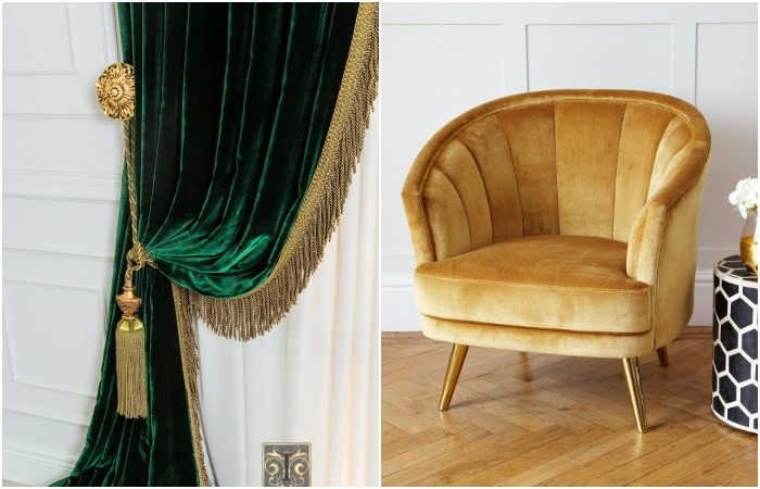 Предсказуемо, что идеальным партнером для бархата является золото во всех его проявлениях. Если вы будете использовать бархатные шторы, дополните их золотой тесьмой сверху или снизу. Декоративные подушки отлично будут смотреться в паре с позолоченными кисточками или бахромой.