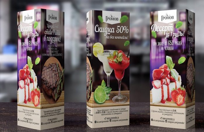 Во многих заведениях на столах можно увидеть тейблтокеры – листовки-домики с информацией о новых блюдах, сезонных напитках, акциях, скидках и пр. Как вы уже, наверное, догадались, они там находятся не просто так. По характеру воздействия тейблтокеры можно сравнить со стойкой с мелочами, которая стоит возле кассы в супермаркете: пока вы ждете свою очередь, рука непроизвольно тянется за жвачкой или батончиком. Так же и здесь: пока вы ждете официанта, взгляд пристально изучает информацию на листовке, и с каждой минутой все сложнее сказать нет этой глянцевой странице с яркими цветами и аппетитными картинками.
