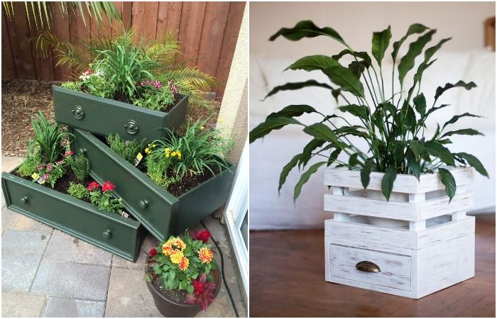 Ваш комод пришел в негодность, но сами ящики находятся в неплохом состоянии? Отлично – у вас появился простор для творчества. Заполните ящик грунтом и посадите в него растение. Что касается внешнего вида новоиспеченного кашпо, то здесь два варианта: можете ничего не менять (актуально, если комод был винтажным, и ящик выглядит немного потрепанным), а можете ошкурить и покрасить. Отталкиваться следует от интерьера квартиры – подумайте, какой цветочный горшок впишется в него лучше. Кстати, если нет готового ящика, вы вполне можете сделать его самостоятельно из старых досок. Молоток и гвозди вам в помощь!