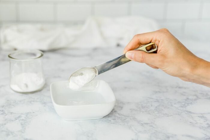 Пищевая сода – эффективное средство во многих случаях, даже в борьбе с пятнами клея. Достаточно развести пару столовых ложек соды с небольшим количеством тёплой воды и гелем для мытья посуды (можно добавить немного жидкого или хозяйственного мыла). Всё это хорошо смешивается до однородной густой массы, похожей на пасту. Средство наносится на участок с помощью старой зубной щётки или кусочком плотной ткани. Необходимо хорошенько, но несильно потереть и оставить на десять минут. Затем всё убрать с помощью салфетки или марли. После вещь отправляется в стирку в обычном режиме.