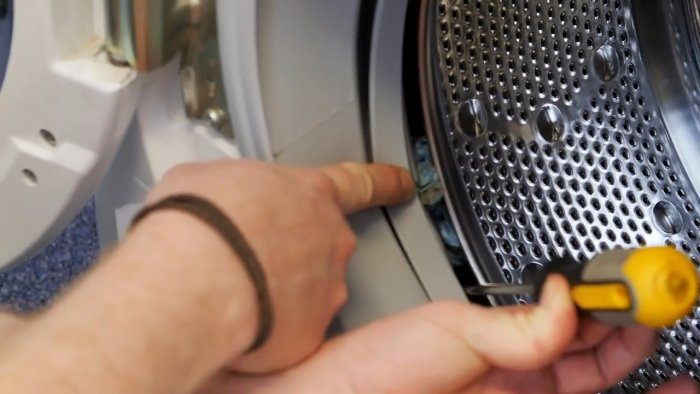 Обнаружить затянутую одежду можно и отодвинув резиновую манжету между загрузочным люком и барабаном.